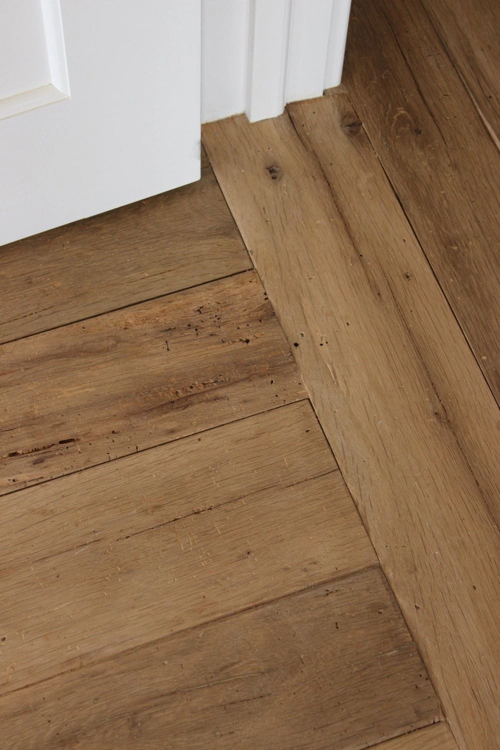 If one floor is a different color and species than the other floor, you can do a few things to pull them together. You can mix up the wood species so that you create a mosaic look that matches both the upstairs and the downstairs.